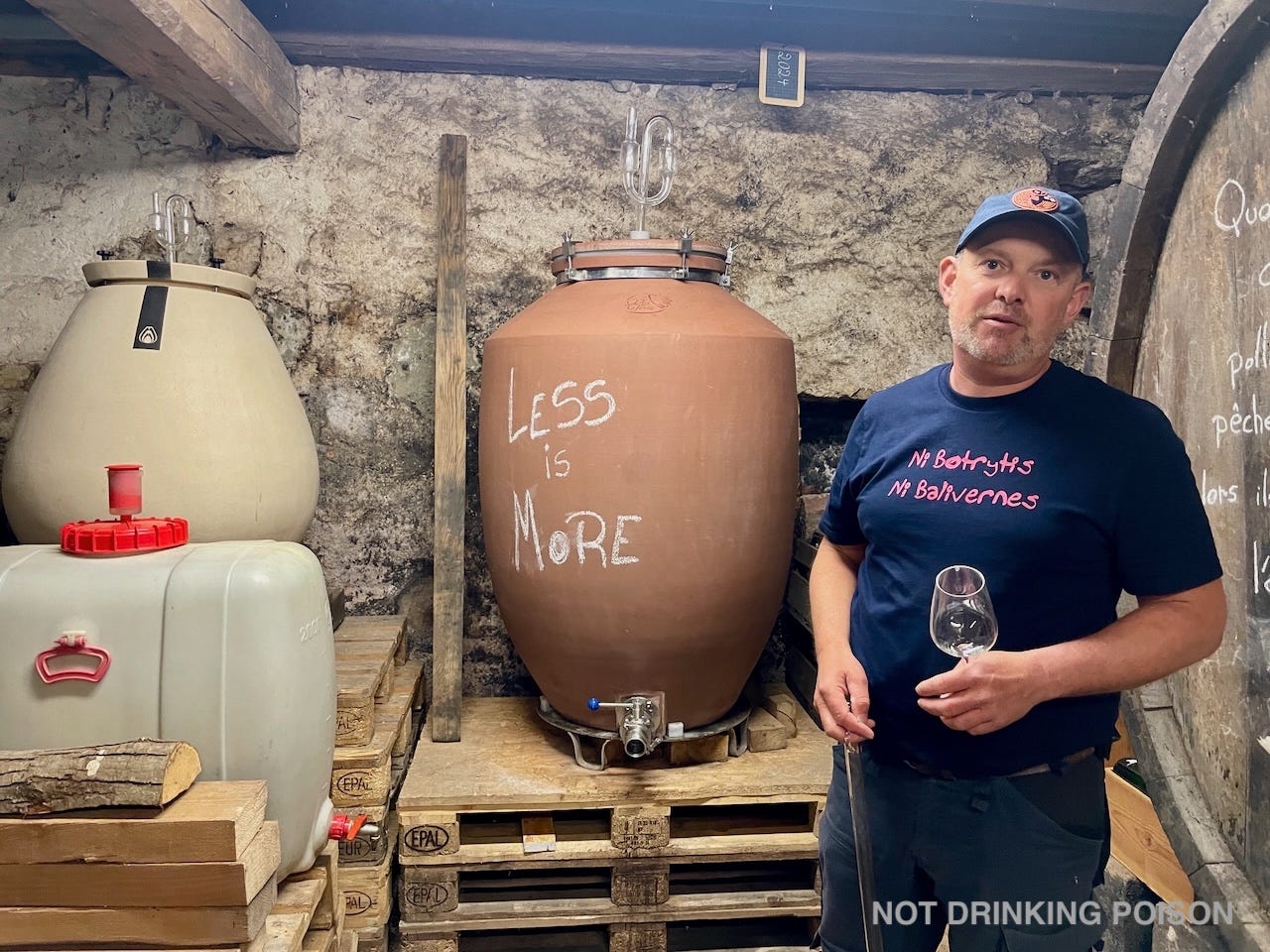 The COVID lockdowns occasioned a career change for Husseren-lès-Châteaux natural vigneron Pierre Groger, who’d spent the previous ten years running erstwhile Colmar natural wine bistrot Cézanne Bistrot à Vin. (Cézanne still exists; its upstairs bistrot is no more.) Groger took on a few tiny parcels of pinot noir, riesling, and gewürztraminer from his parents, retiring winegrowers, and began to work full time in vineyard work, first at Domaine Zind-Humbrecht, and now at the estate of the vigneron whose work first initiated him to natural wine in the early 2000s: Bruno Schueller.